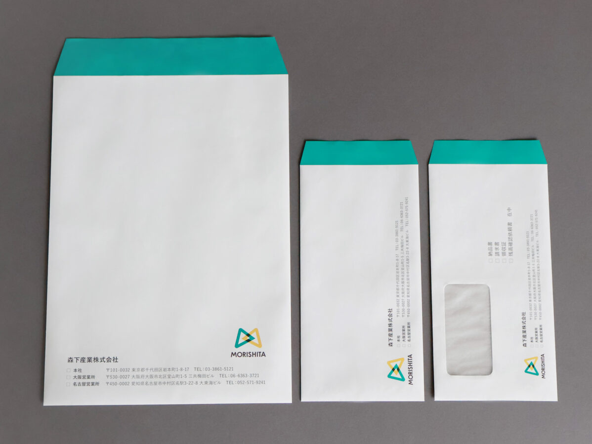 森下産業株式会社 封筒 SERVICE TYPE 会社案内 DESIGN TYPE 名刺/封筒 FIELD 保険・商事 DATE 2025.08 封筒(角2/長3/長3 窓付) CLIENT 森下産業(株) DESIGN (株)スタジオネオ AGENT 富士ビジネス(株)